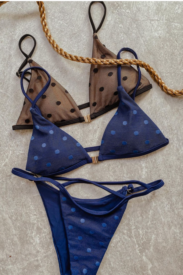 The Chloe is probably our sweetest bikini yet. This feminine little swim set features black polka dot mesh. The top clasps with gorgeous gold hardware and the straps adjust to your perfect fit.