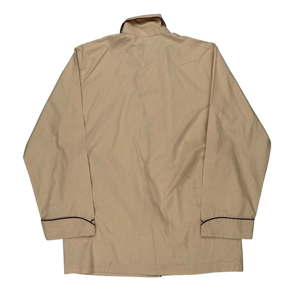 Beige Shirt With Dark Piping On Collar, Cuffs, And Pocket.