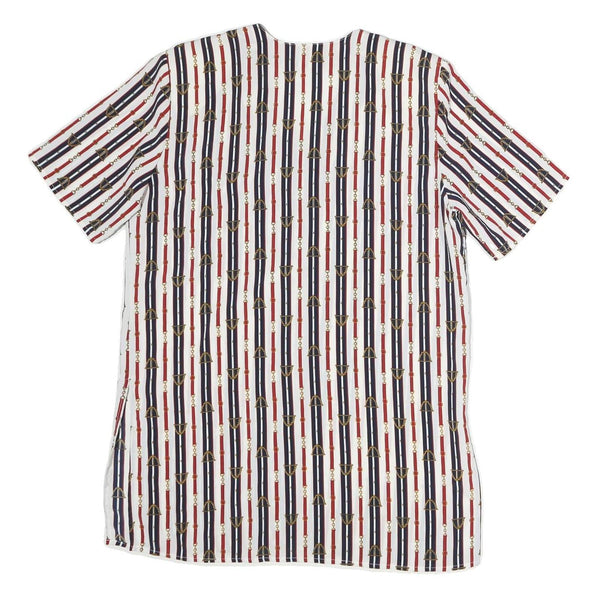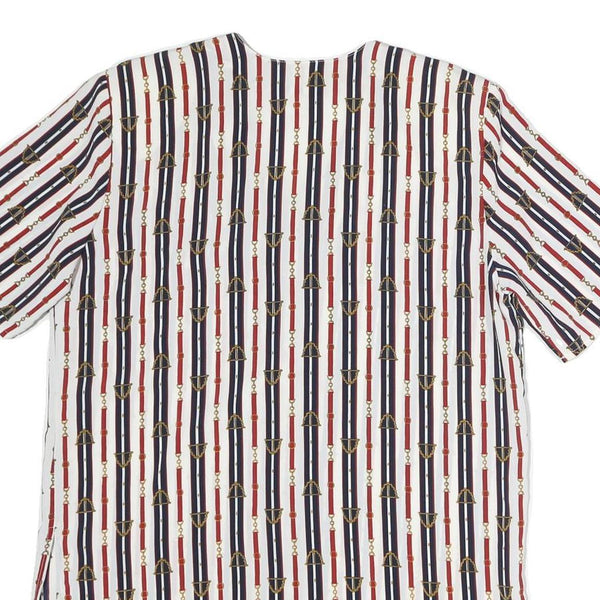 This Christie Jill Womens top features a striking vertical stripe pattern in white, blue, and red, accented with gold-toned links and belt motifs. It has a comfortable V-neckline and short sleeves, complemented by a chest pocket on the front left. The button front closure adds a classic touch to the sophisticated design.