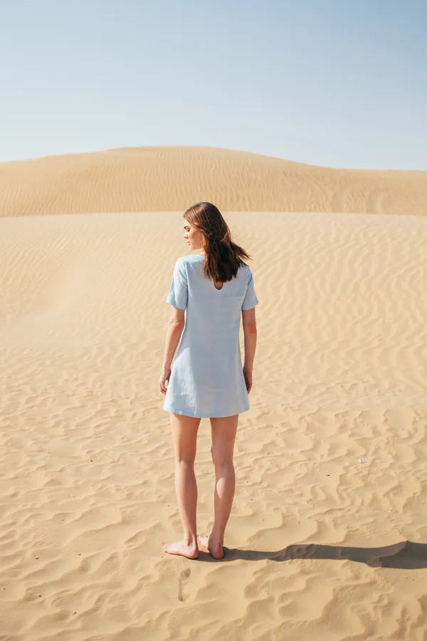 Effortlessly chic every day dress. Classic t-shirt dress that's always in vogue. Cut straight, buttoned at the back, designed for a slightly loose fit. Pair it with slip on sandals or a pair of sneakers.