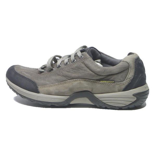 These Clarks womens trainers feature a comfortable lace-up design in a soft grey synthetic upper with darker grey accents on the toe and heel. They have a waterproof construction, clearly marked on the side, ideal for all-weather wear. The trainer sole is sturdy and provides excellent grip for outdoor use.