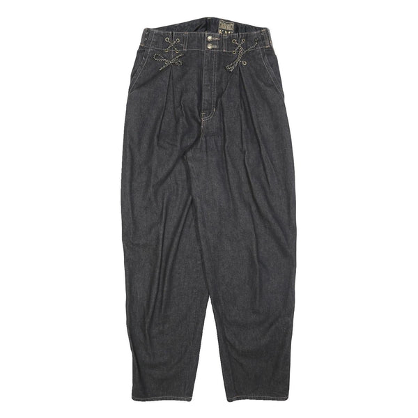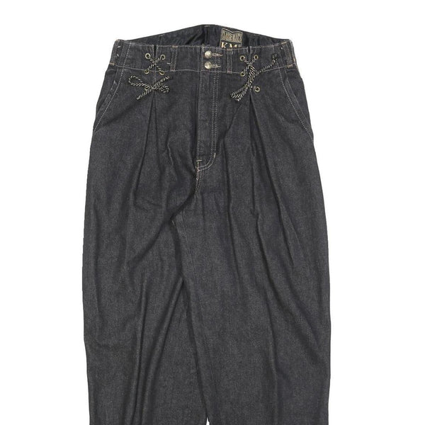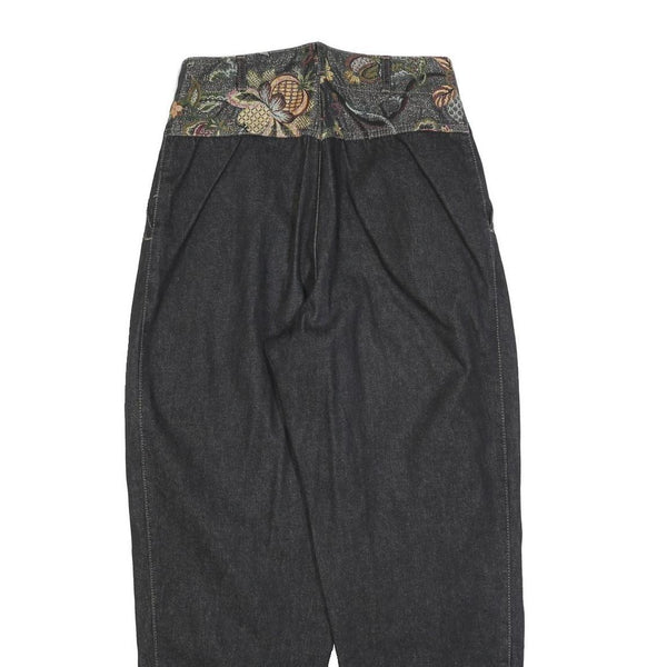 These womens jeans from Classic Blues feature a relaxed fit and a dark denim fabric that offers comfortable wear and a stylish look. The waistband is distinctively adorned with a floral patterned fabric, adding a unique and eye-catching detail to the jeans. The front has zip closure with twin button fastenings and decorative lace-up rope accents above the pockets for added style.