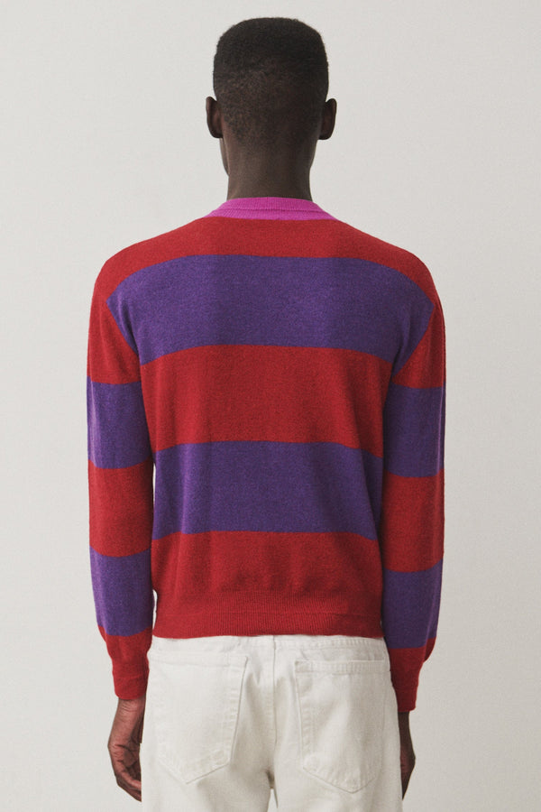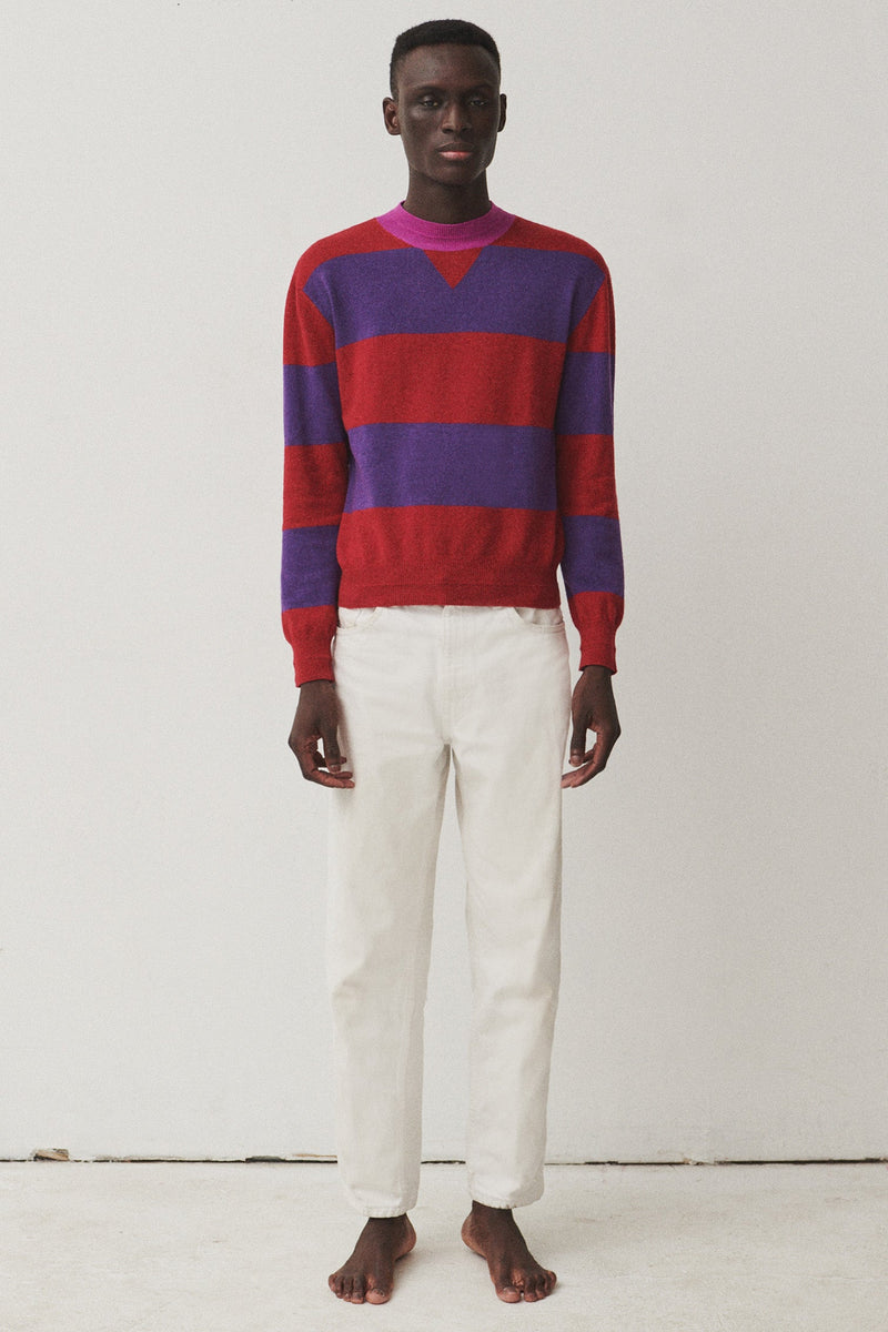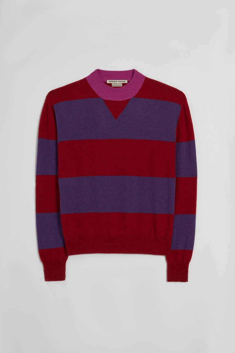 Hey, CLAUDE! Meet our sporty, rugby knit sweater. With its thick, athletic stripes, CLAUDE brings a playful kick to your wardrobe. Its contrasted collar features our signature ribbed neck, which can also be found at the cuffs and on the body trim. A preppy reversed jersey modesty detail at the collar can be found on the front. Light-weight and ultra soft, CLAUDE is is made with 100% recycled fibers. Made in ITALY with love. Unisex.