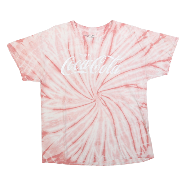 This Coca Cola T-shirt features a vibrant pink and white tie dye pattern with a central swirl design. Across the chest, it displays the iconic "Enjoy Coca-Cola" logo in bold white script, serving as the focal graphic on the front. The back continues the tie dye theme in the same colours for a consistent look.