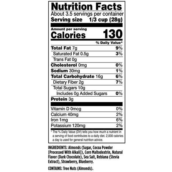 Almonds (Sugar, Cocoa Powder [Processed with Alkali]), Corn Maltodextrin, Natural Flavor (Dark Chocolate), Sea Salt, Rebiana (Stevia Extract), Strawberry, Blueberry