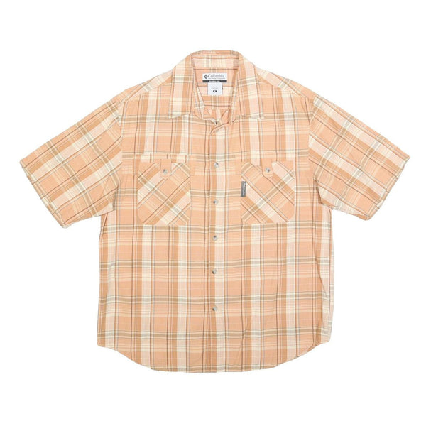 This Columbia short sleeve shirt presents in a soft beige and cream plaid pattern, delivering a relaxed and versatile casual look. The front features two chest pockets with button closures, adding practical style and subtle branding via a small tag on one pocket.