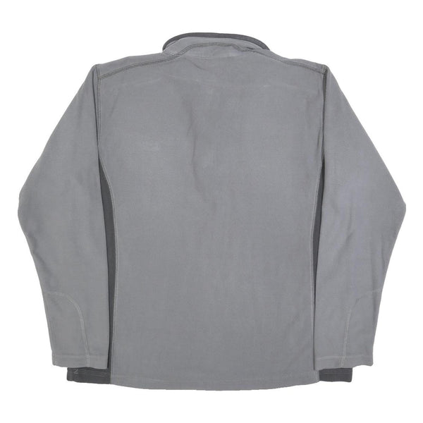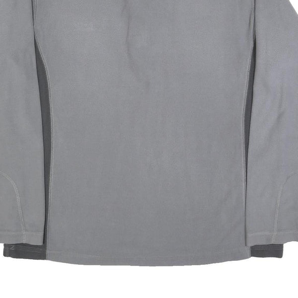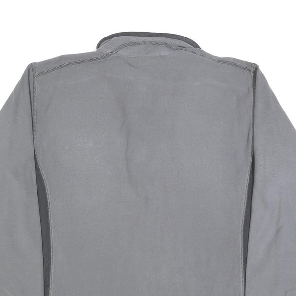 This Columbia mens jumper features a sleek combination of grey and dark grey polyester fleece fabric, offering a soft and comfortable feel. The pullover style includes a quarter zip crew neckline with a dark grey inner collar for added warmth and style. The Columbia logo is embroidered neatly on the left chest in white thread.