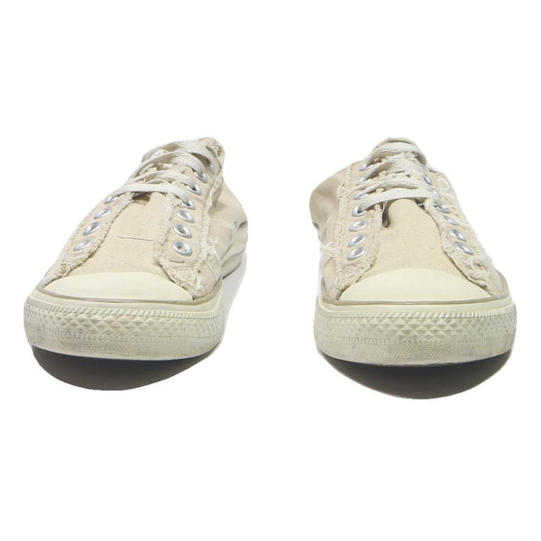 These mens Converse Chuck Taylor All Star low top trainers feature a classic cream cotton blend upper with a distressed, frayed edge design around the lace eyelets and collar area, giving them a vintage-inspired, worn-in look. The iconic rubber toe cap and sole maintain the traditional Converse silhouette with a neutral cream tone throughout.