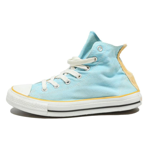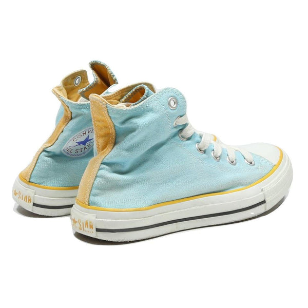 These CONVERSE Chuck Taylor All Star high top trainers feature a light blue canvas upper with distinct white rubber toe caps and soles. The classic design is accented by white laces and metal eyelets, with a subtle yellow trim along the sole edge for added detail. The interior lining is tan, providing a comfortable contrast and vintage-style look.