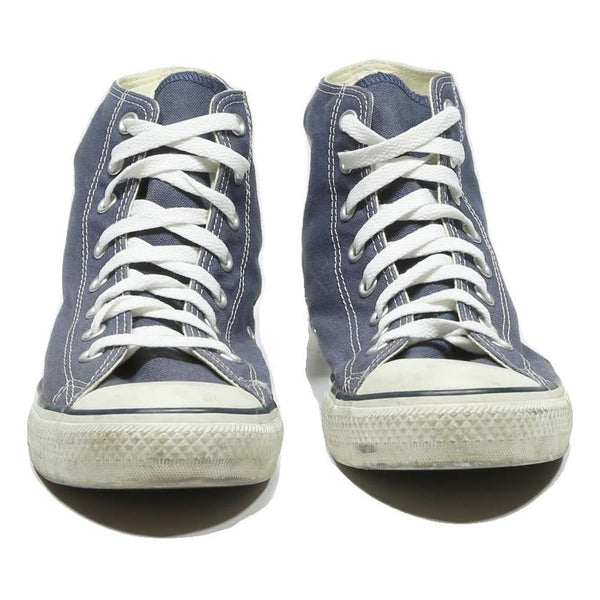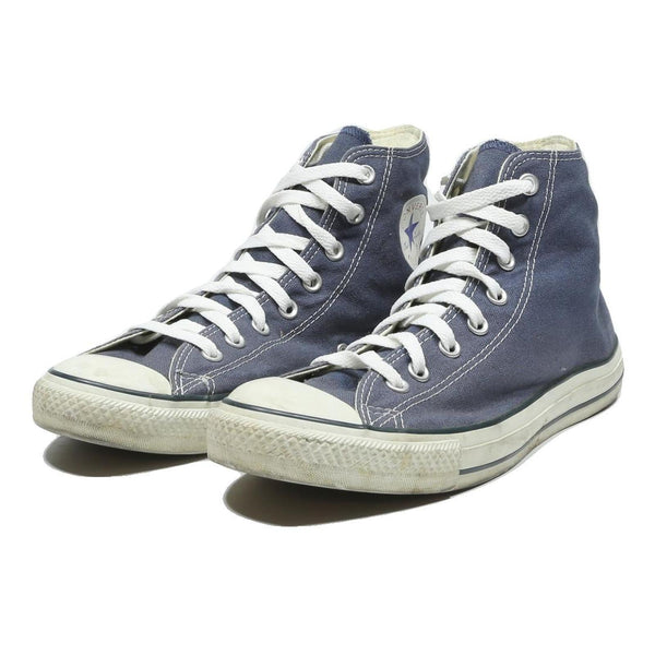 These Converse Chuck Taylor All Star high top trainers feature a classic blue canvas upper with white contrast laces and detailed white stitching. The iconic silhouette is completed with a white rubber sole and toe cap, showing faint signs of wear indicative of their good pre-loved condition.