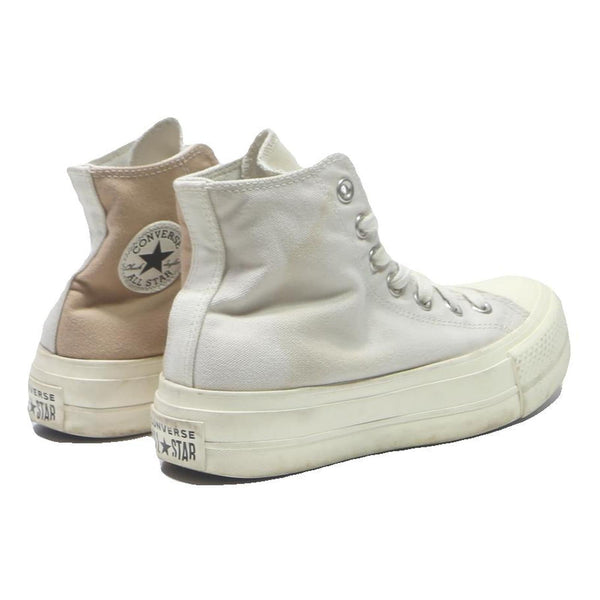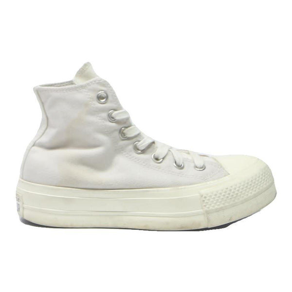 These Converse Chuck Taylor All Star trainers are designed for womens and feature a high top silhouette crafted from sturdy white canvas. The shoes showcase signature silver metal eyelets for the laces and a chunky off-white rubber sole with the classic toe cap and sidewall detailing.