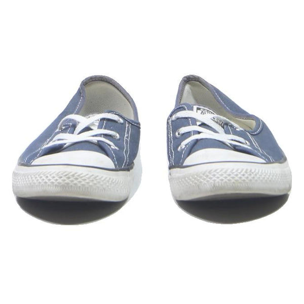 These Converse Chuck Taylor All Star women's trainers feature a low top silhouette in classic blue canvas. They include white rubber soles with black striping and white laces, highlighting the iconic Converse style. The fabric is breathable canvas with metal eyelets for lacing and ventilation.