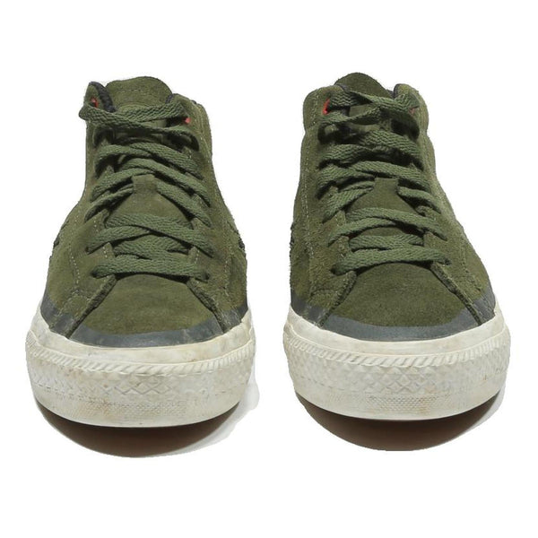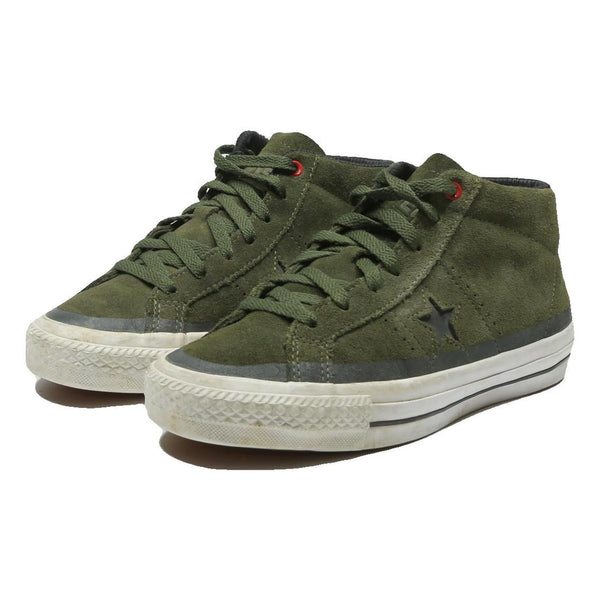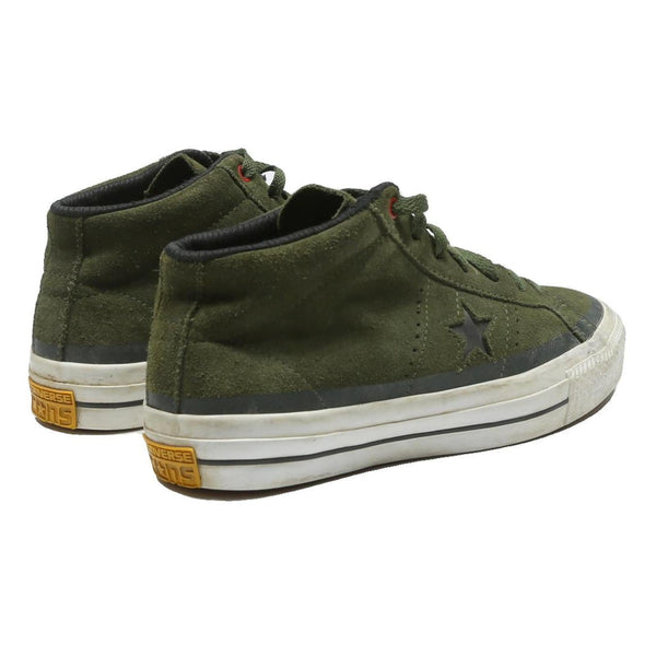 These Converse One Star trainers feature a green synthetic upper with a textured star detail on the side panel. The mid-cut design includes matching green laces and a red eyelet accent near the top lace for a subtle pop of colour.