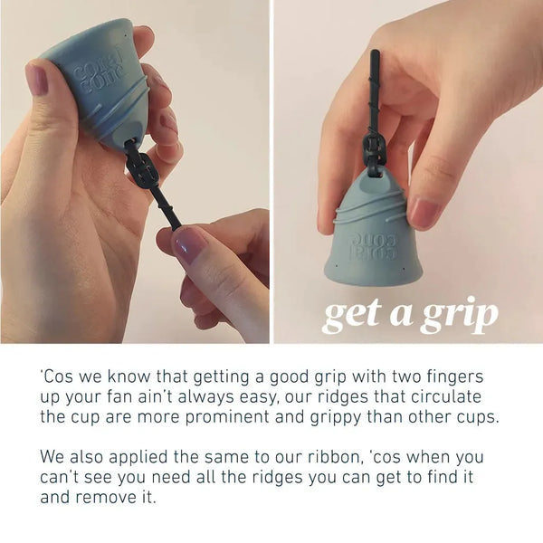 For our shorter cervix-height menstruators - try the Coralcone on its own, sans ribbon. The cup itself has just the right amount of grip, edges, and dimples to make insertion and removal a breeze.
