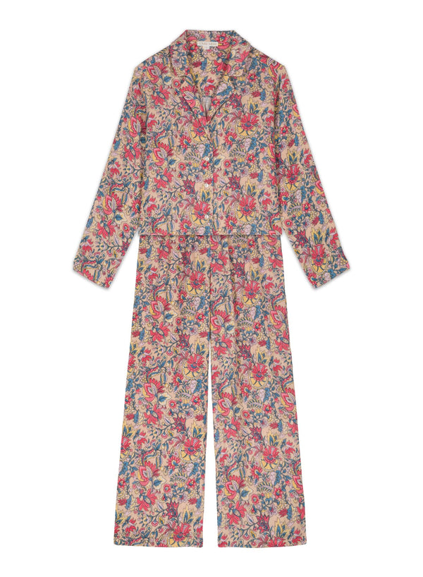 We love good sleep and chill in comfort, introducing the most comfortable and stylish women's pyjamas yet! Yes, we have tested them and these are the best pyjamas! A homeware set that instantly makes you feel at home wherever you are, perfect for home and travel. Organic cotton women's pyjama sets are made with extra soft cotton gauze with an over-floral butter flower print, loose fit and slightly cropped top with a neck shirt collar and, long sleeves, an elastic waist for comfort—designed by Louise Misha. This pyjama set is also the perfect gift for women and moms!