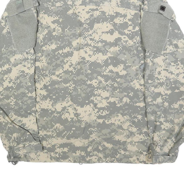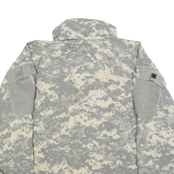 This men's jacket from Creative Apparel features a digital grey camouflage pattern, designed in a military style. The jacket has a front zip closure with a protective flap, adjustable cuffs, and multiple Velcro patches on the arms and chest, adding to its tactical aesthetic.