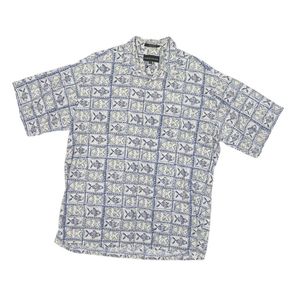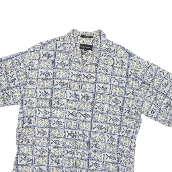 This Croft & Barrow mens shirt features a unique all-over pattern with alternating blue and grey motif squares, incorporating stylised fish and abstract designs. The pattern covers the entire shirt, adding a distinctive casual style. The base colour appears to be a soft white, balancing the bold prints.