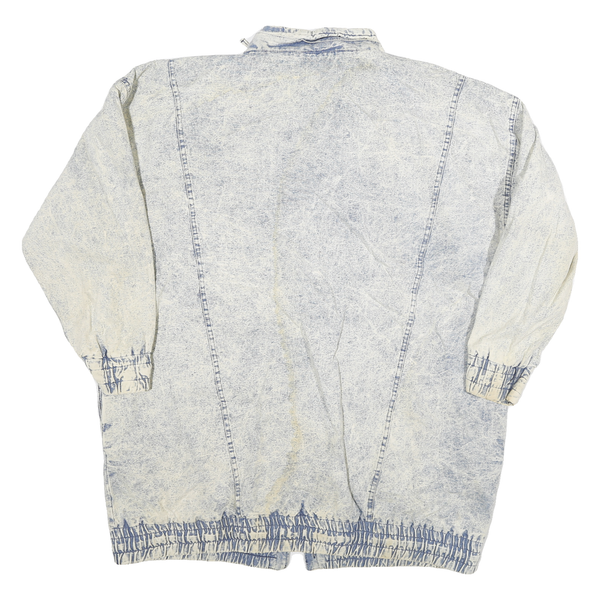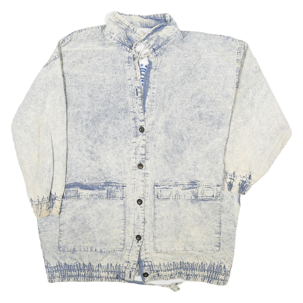 This women's jacket features a unique blue and cream acid wash effect on cotton fabric, creating a distinctive vintage-inspired look. The jacket has a button closure down the front and two large front pockets. It also includes elasticated cuffs and hem with a drawstring at the hem for adjustable fit, contributing to its casual style.