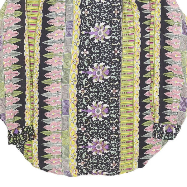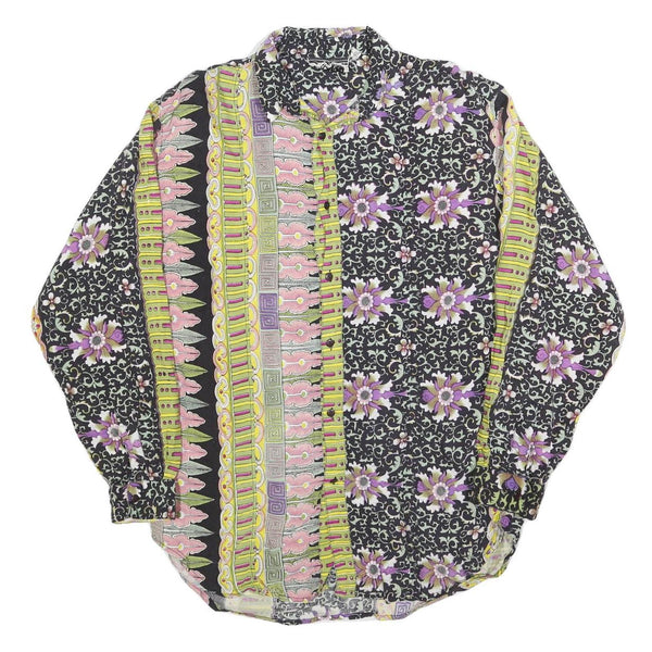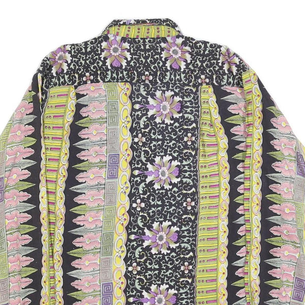 This men's DARA GROFF shirt features an eye-catching pattern with black as the primary background colour complemented by purple and pink floral motifs alongside yellow and green striping details. The design is intricate with ornamental and floral elements creating a vibrant and unique appeal.
