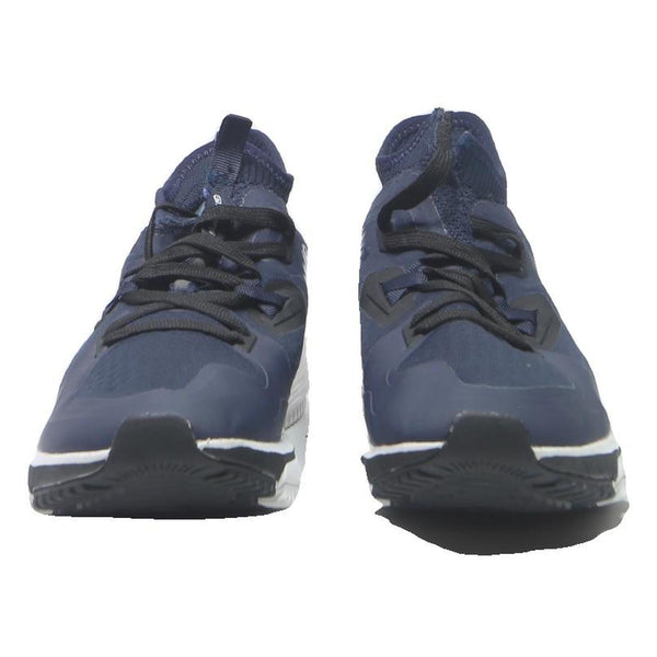 These DECATHLON mens trainers feature a sleek navy blue upper combined with black laces and a distinctive white sole with black detailing. The design is sporty and modern, with subtle branding embossed on the side offering a clean look. The shoes exhibit a low top style with a knitted ankle collar that provides a snug, sock-like fit.