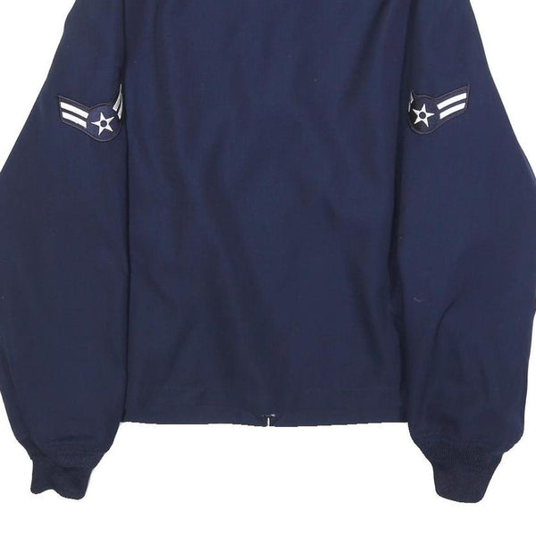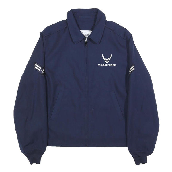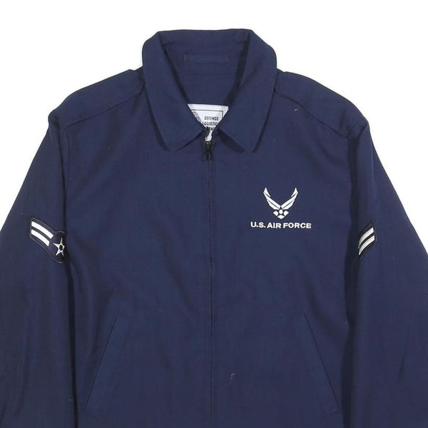 This Womens jacket by Defense Logistics Agency is crafted from a warm wool blend in a deep blue colour. The front features the iconic U.S. Air Force emblem and text in white on the chest, accompanied by matching embroidered insignias on both sleeves, contributing to an authentic military aesthetic. The design is simple and functional with a full zip closure and side pockets.