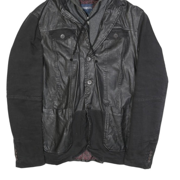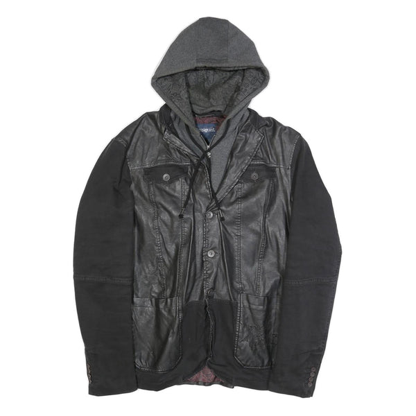 This mens DESIGUAL jacket features a stylish combination of black faux leather front and back panels with contrasting black cotton blend sleeves. It is designed with a soft grey hood attached, adding a layered casual look. The front includes flap chest pockets with buttons and large hand pockets, accented by a button closure overlaying a zip fastener for added style.