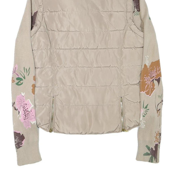 DESIGUAL Womens Beige Floral Sleeve Puffer Jacket S Polyester Blend Zip