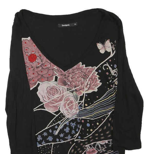 DESIGUAL Womens Black Floral Printed V-Neck Long Sleeve Top XS Stylish Cotton