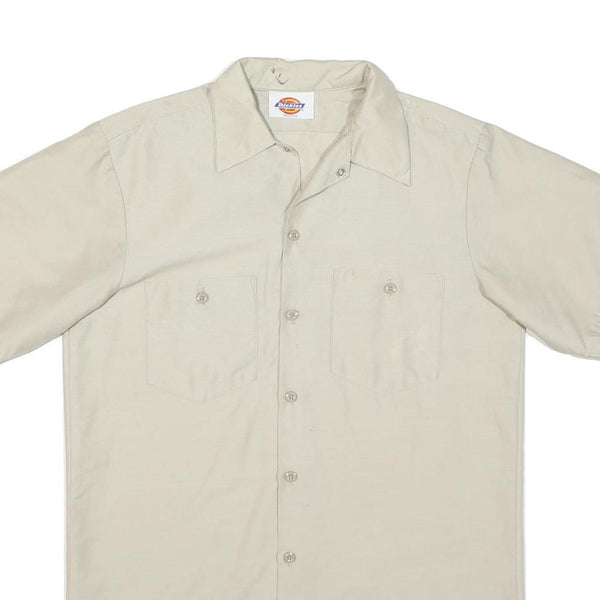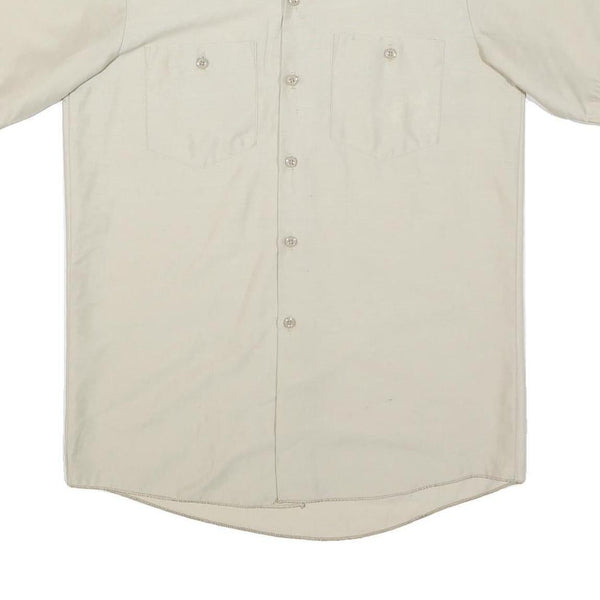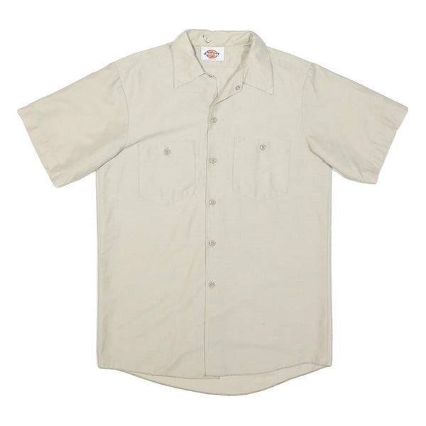 This men's shirt from Dickies features a soft beige cotton blend fabric that offers comfort and durability. It has a classic short sleeve design with a pointed collar and a full button closure down the front. Two buttoned chest pockets add functionality and enhance the workwear style.