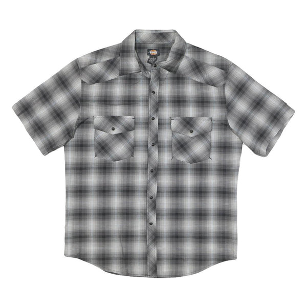 This Mens Dickies shirt features a grey check pattern with subtle tonal variations creating a classic style. It has a traditional pointed collar and a button front closure, complemented by two chest pockets with buttoned flaps for added utility and style.