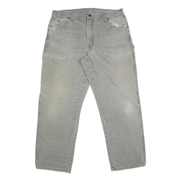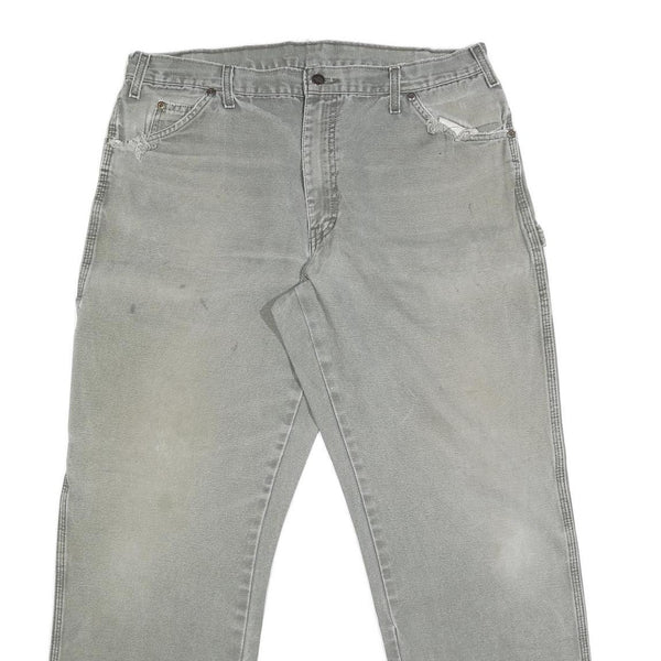 These Dickies mens jeans are made from a cotton blend denim with a light grey wash. The jeans feature a regular fit with straight leg styling and a zip closure. The front shows classic five-pocket design with some wear and distressed detailing at the edges.