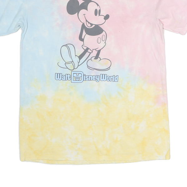 This Disney T-shirt features a charming vintage-style graphic of Mickey Mouse centred on the front with the text "Walt Disney World" below. The shirt showcases a unique pastel tie-dye pattern blending soft blue, pink, and yellow hues across the entire fabric, giving it a fun and playful look.