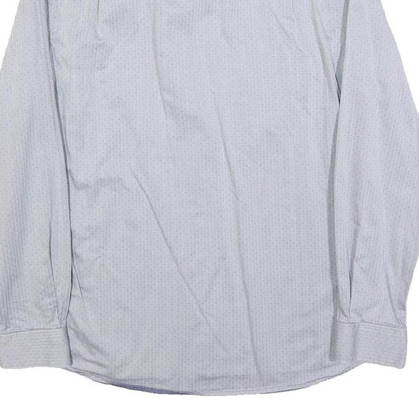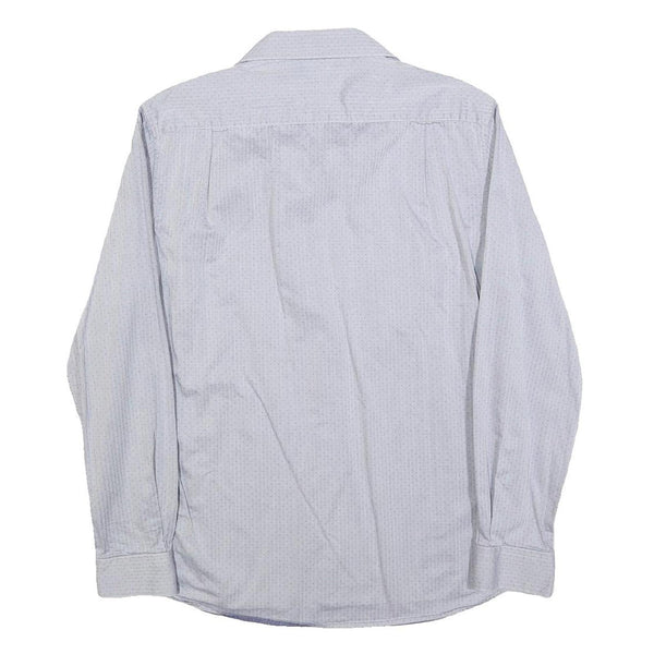 This DKNY mens shirt features a subtle blue tone with an intricate small patterned design throughout, adding understated texture and interest to the piece. The front has a classic button-down fastening with white buttons and a neat pointed collar, complemented by long sleeves with buttoned cuffs for a traditional dress shirt look.