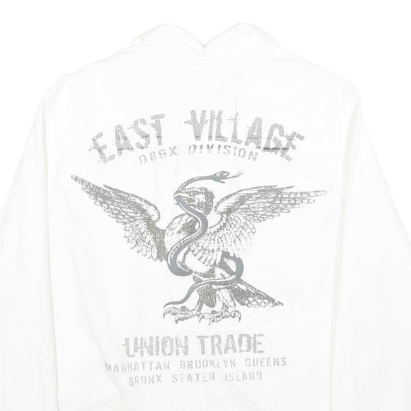 This DKNY Mens shirt features a crisp white colour crafted from a soft cotton blend for comfortable wear. The front has a classic button-down style with two flap chest pockets, offering both style and practicality. The back displays a bold graphic print with an eagle and text reading "East Village" and references to Manhattan, Brooklyn, Queens, Bronx, and Staten Island, adding an urban edge to this casual shirt.