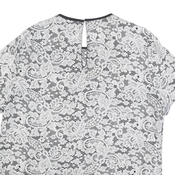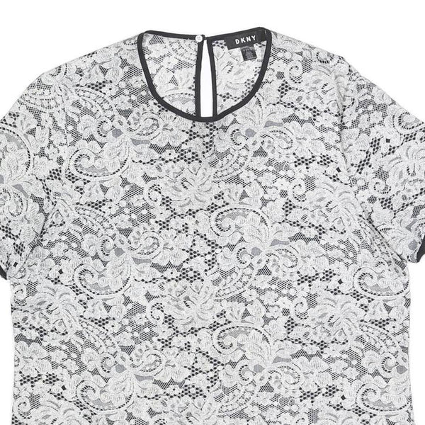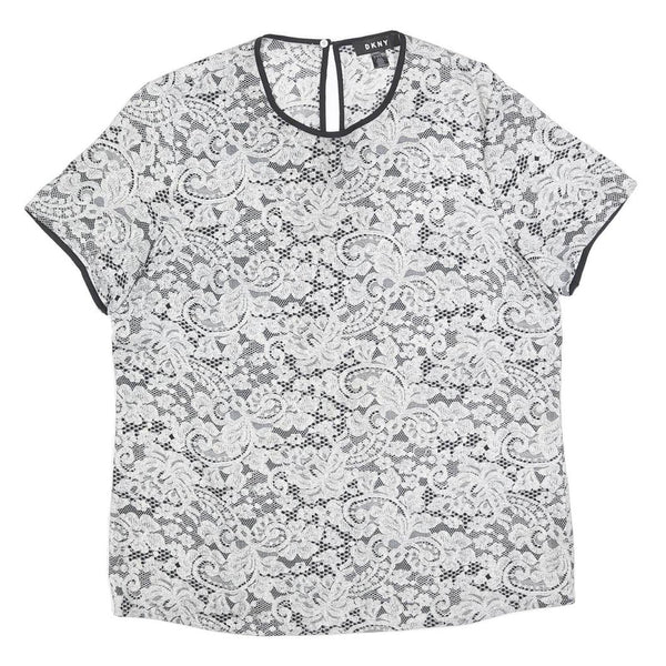 This DKNY womens top features an elegant black and white lace overlay with intricate floral patterns that create a sophisticated and feminine appearance. The short sleeves and round neckline are trimmed neatly with solid black fabric, adding contrast and definition to the delicate lace design. A keyhole button fastening at the back neckline lends a subtle decorative detail.
