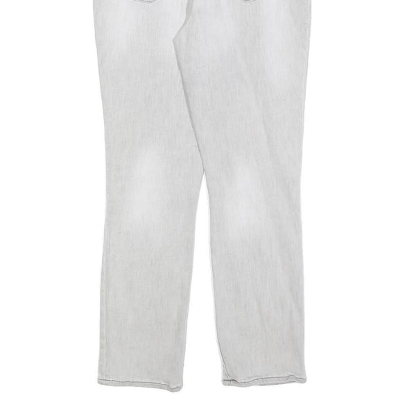 These DKNY womens jeans feature a light grey denim colour with a subtle faded wash effect throughout for a stylish look. The jeans have a slim fit style with a skinny leg silhouette, fastening with a zip closure at the front. They boast classic five-pocket styling with rivet detailing, and a branded label patch on the back waistband.