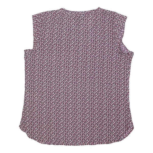 This DKNY womens top features a rich purple base adorned with a subtle, intricate printed pattern for a modern and sophisticated look. The sleeveless design paired with a round neck provides a classic and versatile silhouette perfect for layering or wearing alone in warmer weather.