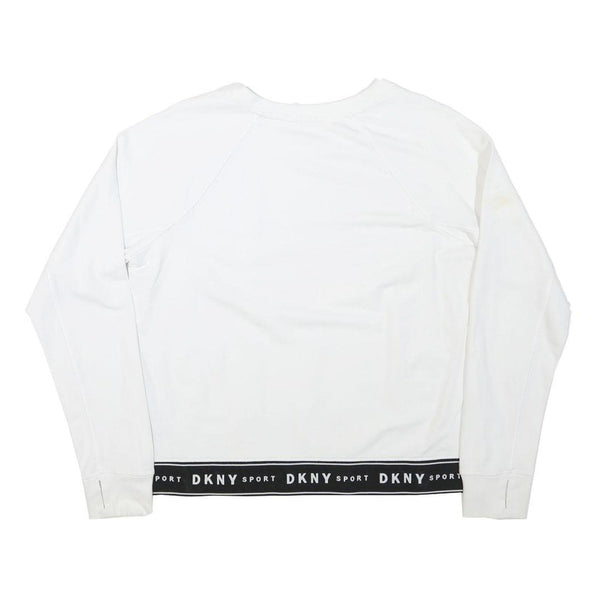 This womens DKNY sweatshirt features a clean white design with a classic crew neck. The garment is accented with a black hem trim displaying "DKNY Sport" branding in repeating white text, adding a sporty touch to the minimalist look. The sweatshirt has long sleeves and a regular fit, providing comfortable everyday wear.