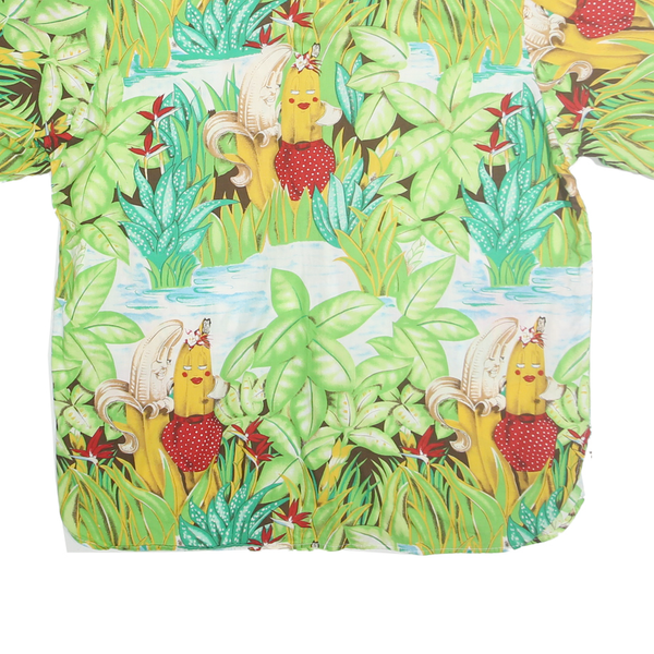This vibrant Dr Beach shirt features a rich tropical print that includes lush green leaves, playful banana graphics adorned with red polka dot skirts, and light blue water accents. The design is eye-catching with a fun, summery theme perfectly suited for casual, warm-weather occasions.