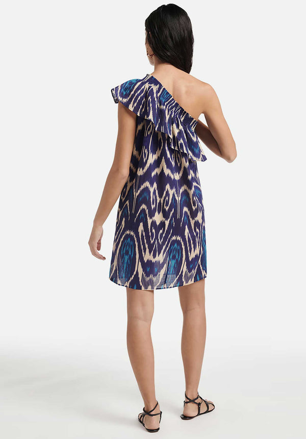 You know our star print of the season, inspired by an ancient technique. Much to your delight, you'll find it on this little one shoulder dress, which is very simple but charming and fresh with its flared baby doll volu