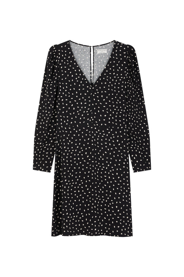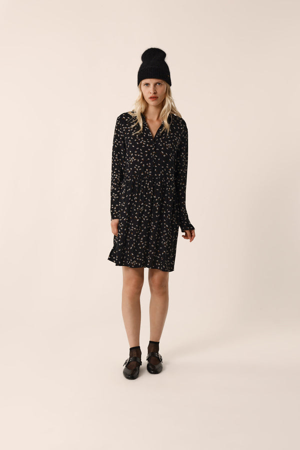 An iconic des Petits Hauts Piece, this new version of the Valencia Black Flowing and Lightweight Viscose Dress Features A Romantic Floral Pattern.With Long Sleeves, A Classic Collar and Gathers at the Waist, it has a slightly loose, cropped cut and a folk-tetyle look to flatter your figure.