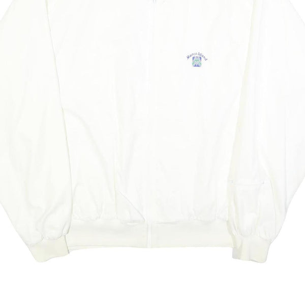 This mens jacket by DUCKSTER is crafted in a clean white colour, featuring a discreet, small embroidered logo on the left chest that reads 'Marco Island' above a blue and green emblem. The jacket exhibits a polo collar and a full front zip closure for easy wear. The fabric is smooth polyester, offering lightweight comfort and durability.