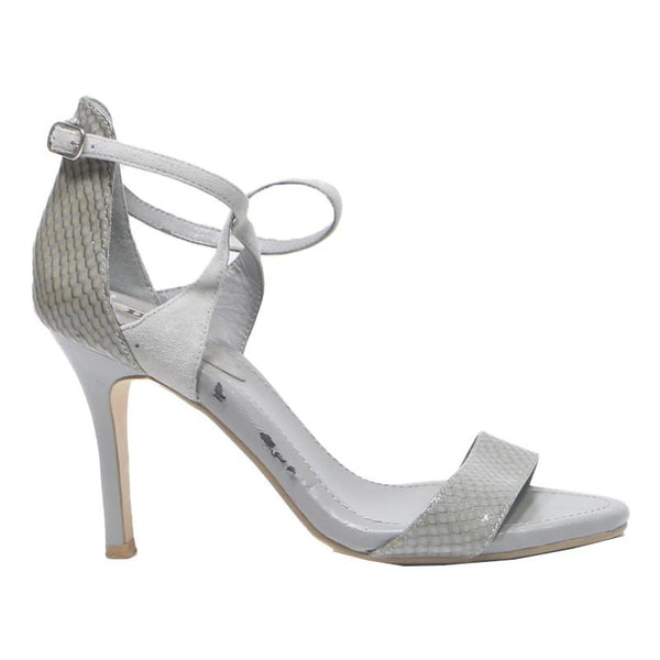 These DUNE Womens high heels feature a sleek grey leather design with subtle embossed texture on the straps and heel counter, adding an elegant touch. The open toe and ankle strap design offer a feminine and stylish appearance.