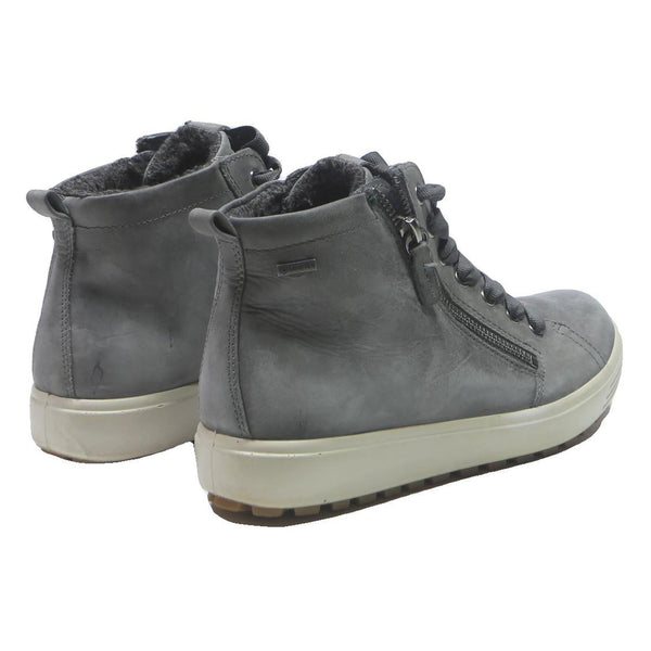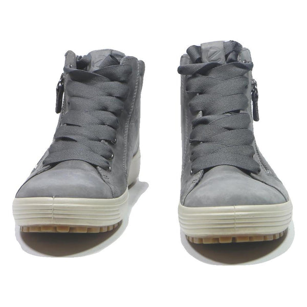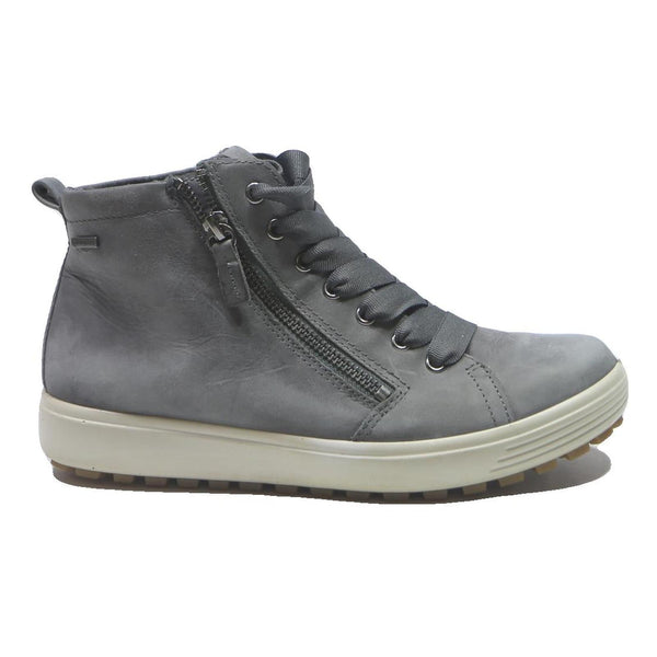 These ECCO Womens Soft 7 ankle boots showcase a sleek grey suede upper with a smooth finish, complemented by a side zip and lace fastening for easy wear. The design features metal eyelets and a padded collar for added comfort and support.
