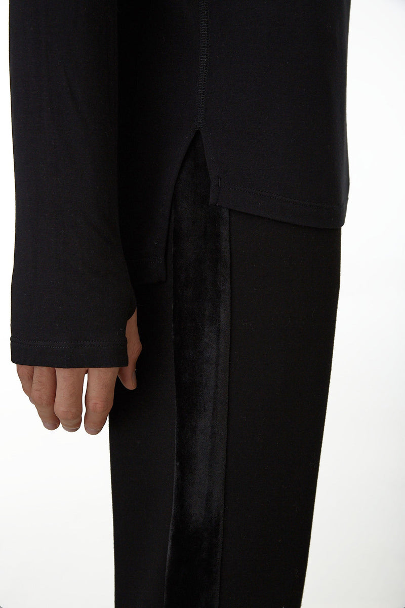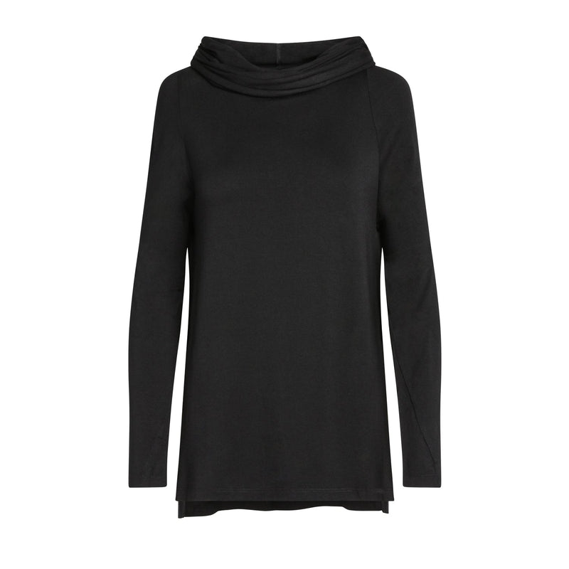 This modern and minimalist long sleeve hoodie doubles as a turtleneck top. It’s made with sustainable micromodal fabric for luxurious softness and lasting quality. Finished with low-profile thumb holes and flatlock seam details on the side and hood, this piece offers strong dimension and creative versatility.