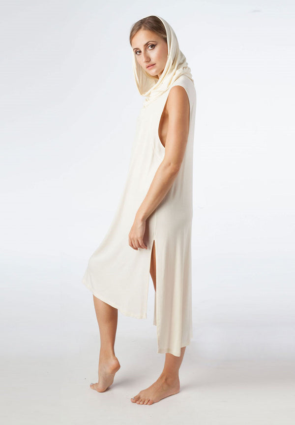 Echapé: To not be reached by someone or something, to evade them... A longer version of our classic Echape Top, this piece offers unbelievable versatility. Crafted with our sustainable micromodal fabric and flatlock seams, you’ll notice that the durable quality is made to last. And with finishing details like the low armholes, soft draping and sporty hood, you can go anywhere feeling chic and comfortable.