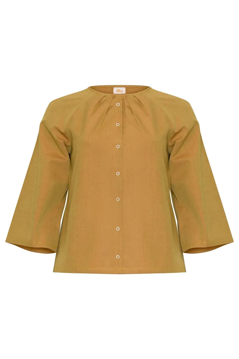 The long-sleeved Eilish shirt has a playful, flowing A-line silhouette with flared raglan sleeves. This versatile top can be worn tucked into skinny jeans or layered over a dress. Made in England from 100% organic cotton cross-weave fabric and features contrast press studs and a pleated neckline.