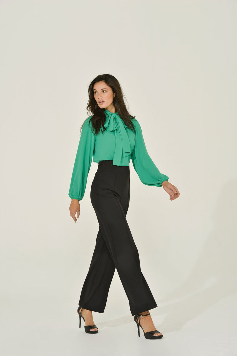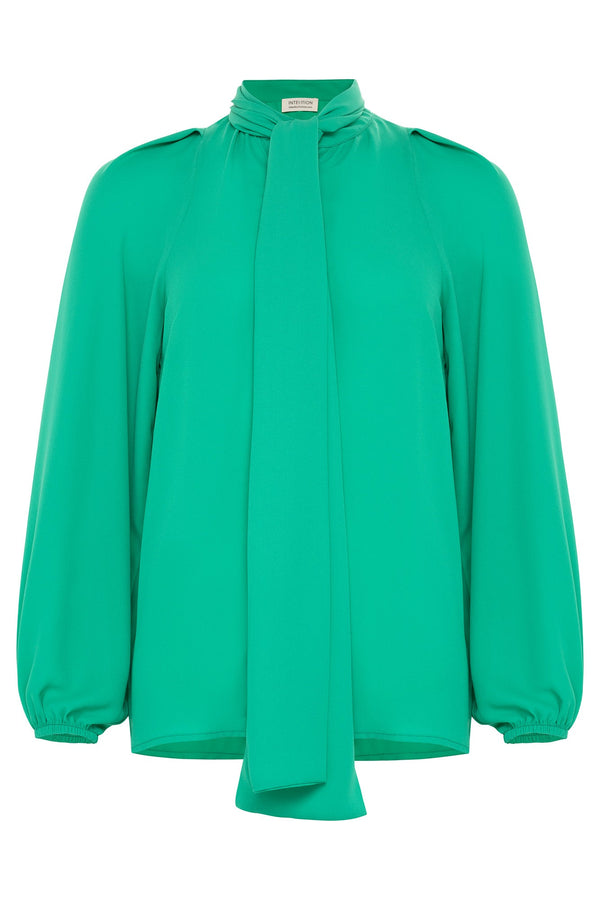 Transition from business to casual with this emerald green mandarin collar blouse with bishop sleeves and dramatic, optional bow for countless styling options. Made in the USA from 100% recycled polyester from PET bottles, our mess chiffon is OEKO-TEX® 100, and GRS certified. This blouse is free from harmful chemicals and dipped dyed for a stunning earth-friendly addition to your essential wardrobe.