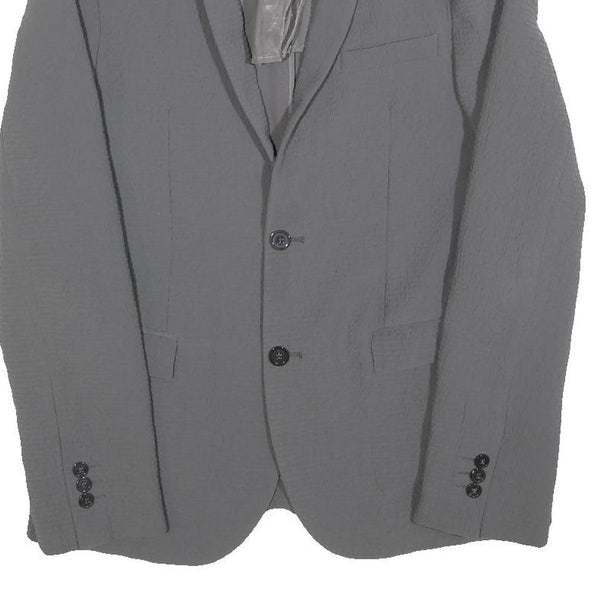 This Emporio Armani mens jacket is crafted from a smooth grey polyester fabric, offering a subtly textured finish. It features a classic tailored fit with a neat, plain pattern that enhances its sophisticated appeal. The front has a two-button closure and a notched collar, adding to the sleek, formal style.