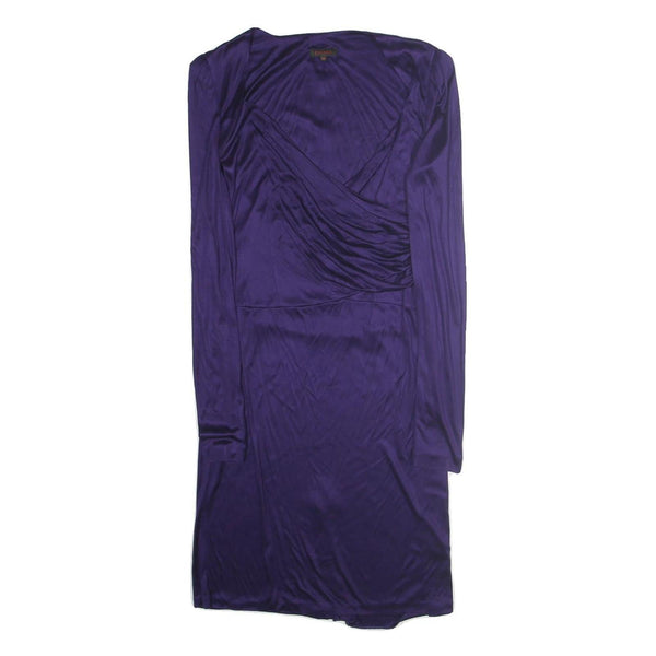 This elegant ESCADA women's dress features a rich purple colour crafted from smooth polyester fabric with a subtle sheen. The design incorporates a flattering wrap-style bodice with gentle draping across the chest, complementing its long sleeves and midi length for a sophisticated silhouette.